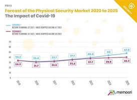 In June 2020, the World Bank published a baseline forecast envisioning a 5.2% contraction in global GDP in 2020. Against this backdrop, the Memoori report delivers a best estimate of the global market for physical security products going forward to 2025 based on two scenarios. At this time, Covid-19 has been having second spikes in Q3 / Q4 and several countries are experiencing rolling lockdowns. On this basis, Memoori researchers believe their 2nd scenario looks most feasible where global markets take around a year to return to some normality and mass global adoption of a vaccine is achieved within 18 months. Memoori suggests this scenario has a probability of 65%.